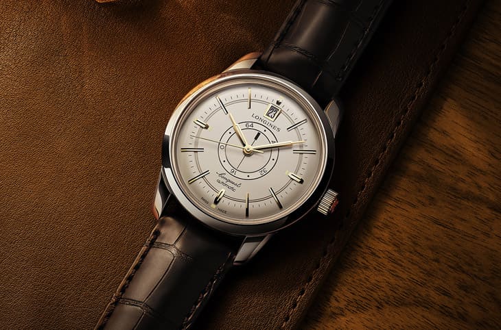 Conquest Ref.9028当年一鸣惊人的关键即在于浪琴表开启表坛先例开发出的动力储存显示,这项特色如今也在Conquest Heritage中央动力储存显示腕表身上忠实重现。表坛上具有动力储存显示的作品往往採用指针搭配刻度、转盘上的色块,或是直观以阿拉伯数字代表动力消耗情形,然而Conquest Heritage中央动力储存显示腕表却是透过面盘中央的两枚旋转圆盘,将无形的动力变化转化成面盘上可见的资讯。外侧的转盘以8小时为单位刻度,可见阿拉伯数字与圆点交错;而内侧转盘则是一支棍形指标。比起传统指针式仅有指针单向移动,两枚转盘连动机芯发条盒,透过刻度转盘与指标移动呈现动力储存,这样的显示更富动态感,能马上观察到腕表的动力状况,又不会抢去走时指针的焦点。有趣的是,若是腕表停走以手动方式上链,补充满64小时的动力之后,内外侧转盘会随着发条拧紧而连动,棍形指标会再从64小时刻度开始重新展示动力消长状态,面盘彷彿多了一股视觉变化的恆动性,赏玩间增添引人入胜的逸趣。