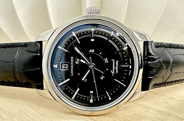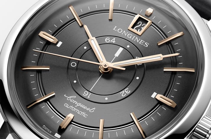 Conquest Heritage中央动力储存显示腕表并未採取限量发行,而且表壳材质一律採用入门并耐用的不锈钢,可是浪琴表仍旧展现满满诚意一口气延伸出香檳色、无烟煤色或黑色等三种面盘款式,除了无烟煤色面盘配置灰色皮革表带外,另外两种顏色也都同步用上黑色皮革表带。三款Conquest Heritage中央动力储存显示腕表的大三针格局面盘完整反映系列倍受市场推崇的简约精致设计哲学,包括摩天大楼造型时、分针,少见设置在12点方向的梯形边框日期窗,以及立体镶嵌金属时标等细节,在面盘上呈现出丰富的立体层次,品牌仿效Ref.9028的设计,以一圈环线刻纹串连时标,在刻纹外侧另印上分钟刻度,使得佩戴者能够清楚区辨时间资讯;值得一提的是,浪琴表依据不同面盘顏色,也会将时标与指针镀上相异的色彩,塑造出不同视觉个性,如香檳色配黄金色、无烟煤色配玫瑰金色,而黑色则是配上银色,由指针、时标和面盘顏色显现的对比感,提供一目瞭然的阅时效果。腕表于面盘6点方向印有草写的"Conquest"字样与传统样式的automatic字样,画龙点睛地强化其灵感来自早期经典杰作的复古灵魂。