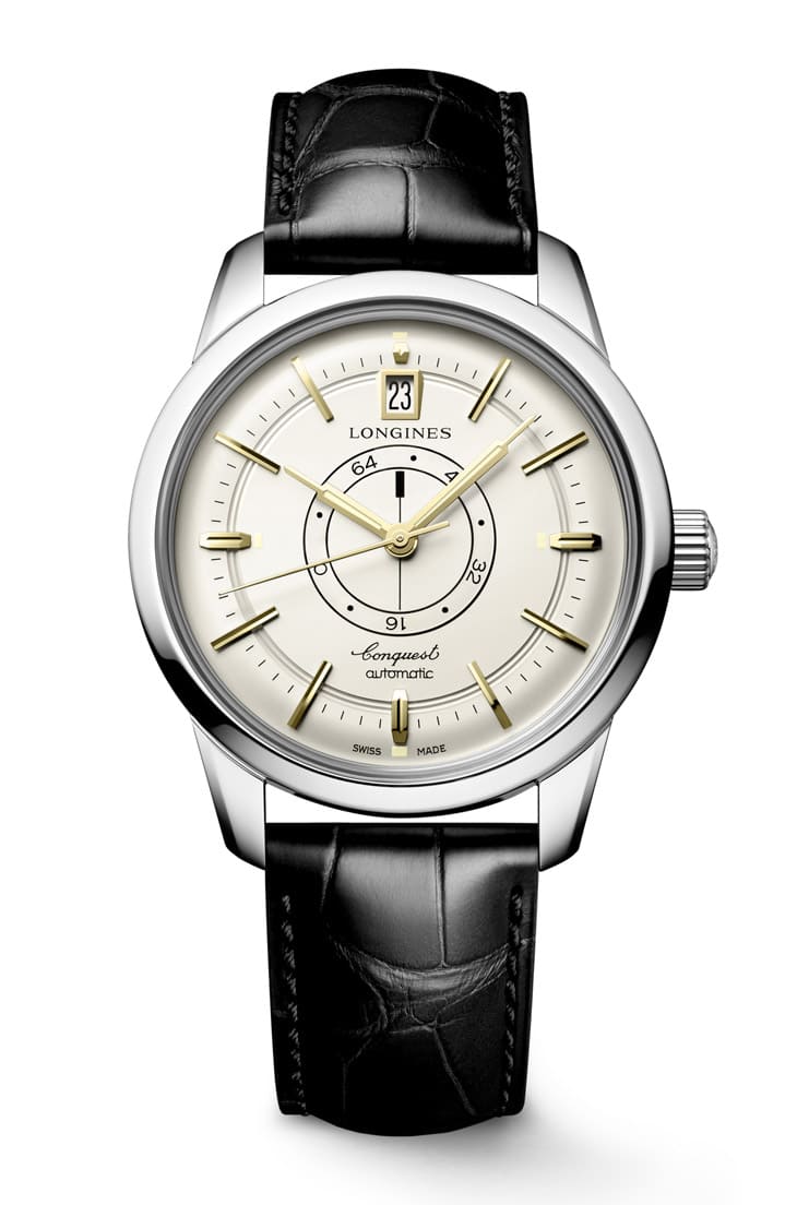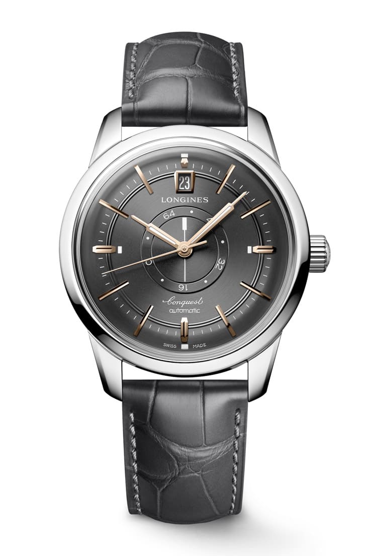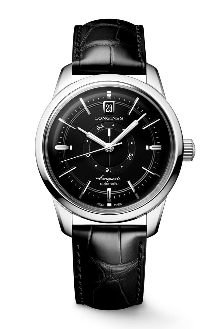 ▲Conquest Heritage中央动力储存显示腕表同步释出包含黑色等三种面盘配色款式,其指针与时标顏色也有相应变化,使其优雅简洁的盘面造型散发各有千秋的个性。
