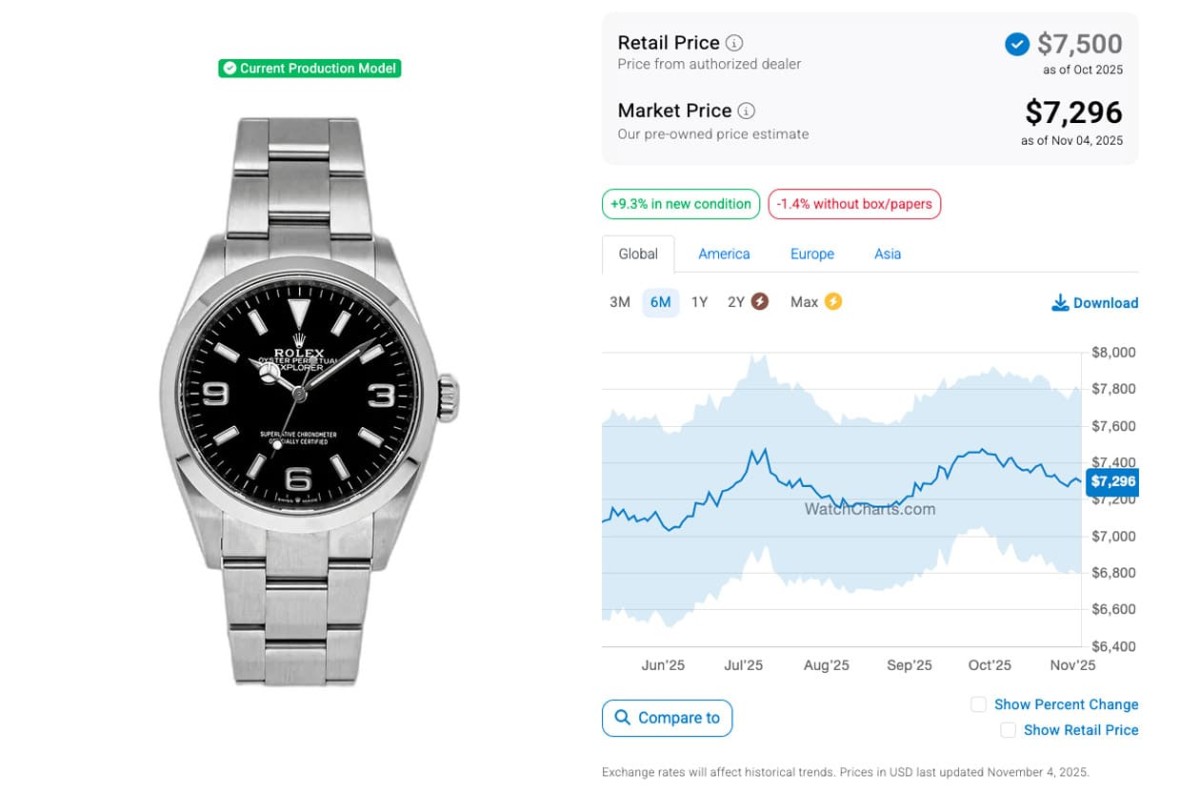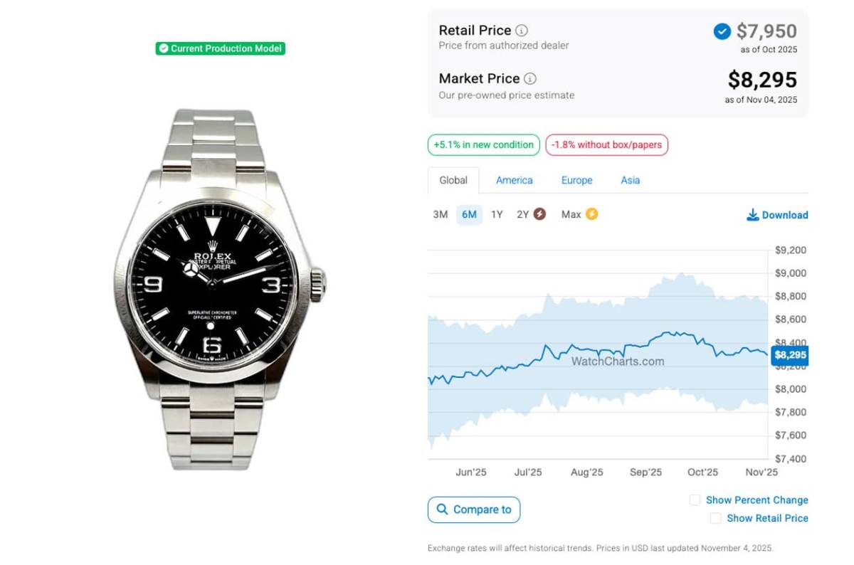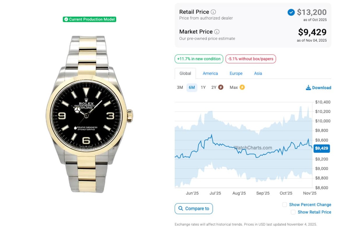 Explorer探一属于入门型的劳力士运动表,在各国市场中日本对这款表的喜爱度甚高(受到日剧天王木村拓哉代表作《恋爱世代》的影响),因此探一在日本二级市场的溢价情况比较明显,但是如果把同一款表放到全球范围,探一的受欢迎程度倒是没这麼夸张。根据高级手表市场调查研究机构WatchCharts的资料,此系列近年的身价也是从2022年第2季开始直直落,稍微把时间拉近至2025年5月时,当时36mm的不锈钢款124270国外报价为7,078美金(约合台币21万8)、半金款124273则已经处于定价线之下的9,248美金(约合台币28万6),至于40mm的不锈钢款224270因为怎麼说表径对男性还是更受欢迎,所以行情还是较佳,达到8,100美金(约合台币25万),光从只有这款属于超定价的水准来看,显然今时今日市场对40mm这样的尺寸还是更有爱。