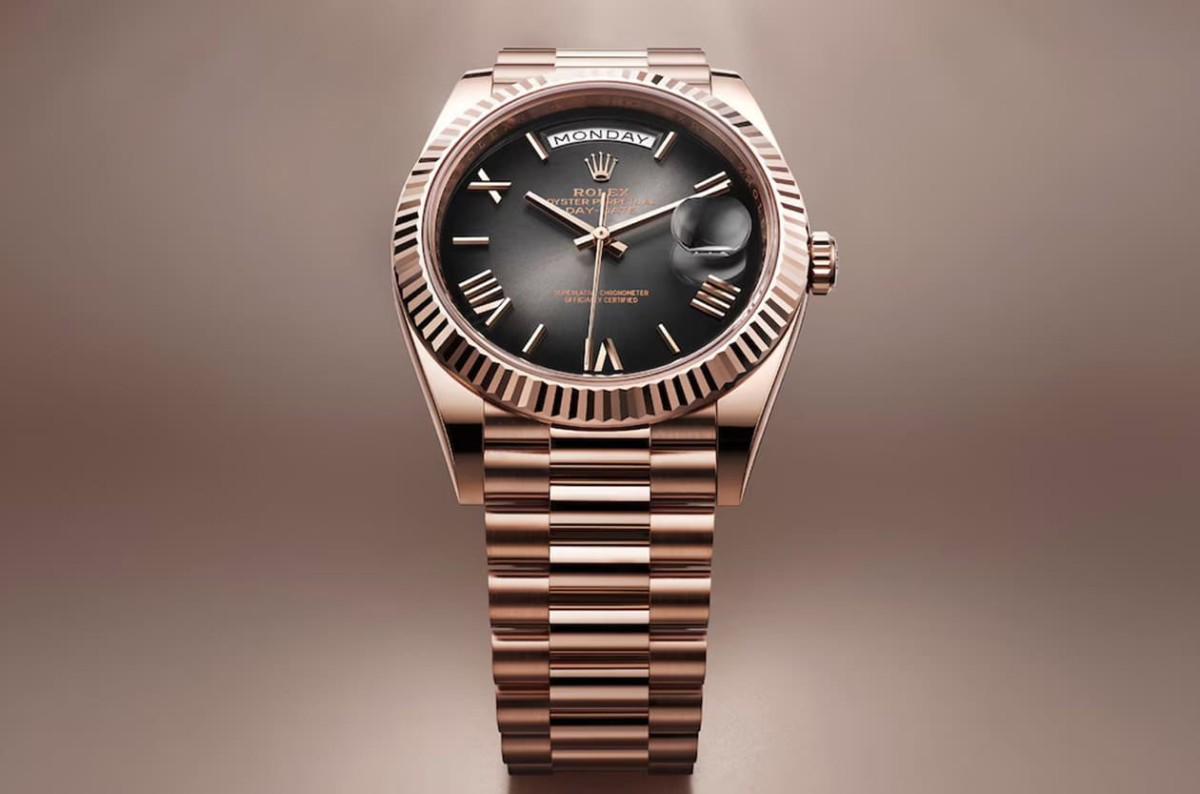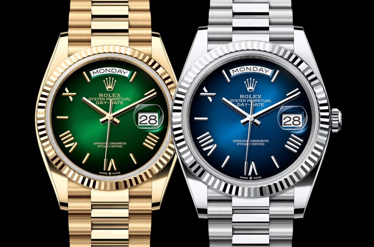 这部分就以前文提到的228235为代表,劳力士于太阳放射纹、漆面之外,增加了近年高级品牌逐渐盛行的渐层面盘,于是我们可以看到Day-Date 40的永恒玫瑰金款增加石板灰色渐层、黄金款有绿色渐层,至于白金款和铂金款也都加入了蓝色渐层可供市场选择。过去Day-Date其实就出现过渐层面盘,不过那时劳力士是套用在Day-Date 36上,而且渐层面盘往往搭配钻石时标,如今Day-Date 40也「反向」从36mm款式上汲取渐层面盘元素,并且与罗马数字时标搭配,这让手表又有了一种微妙的视觉新奇感,对收藏家来说又是一个改得很切中人心的狠招。