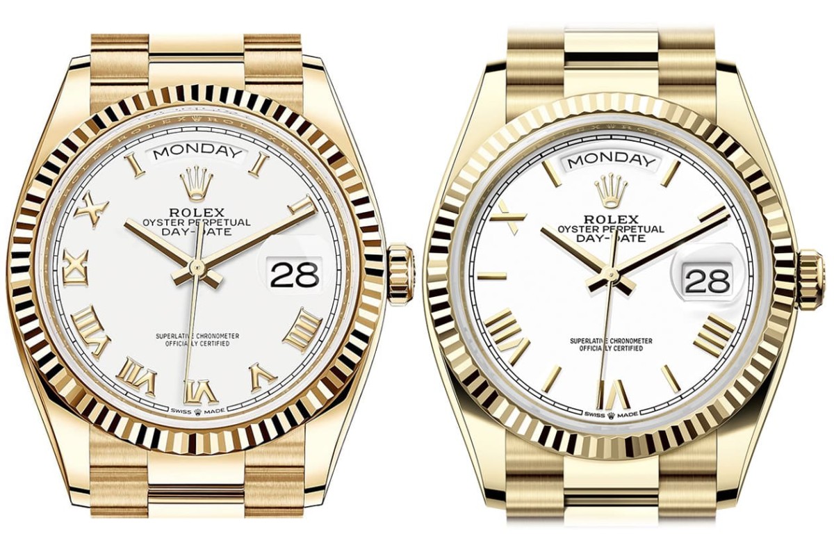 ▲左为旧式Day-Date 36、右为新式Day-Date 36,细看它们的罗马数字时标造型有变。
