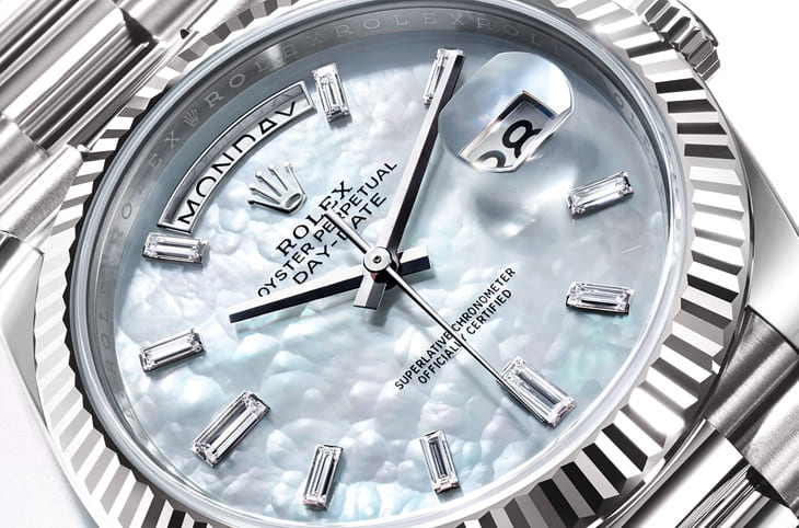 ▲Day-Date 40今年无论白金、黄金、永恒玫瑰金或铂金都新增珍珠母贝面盘选择。