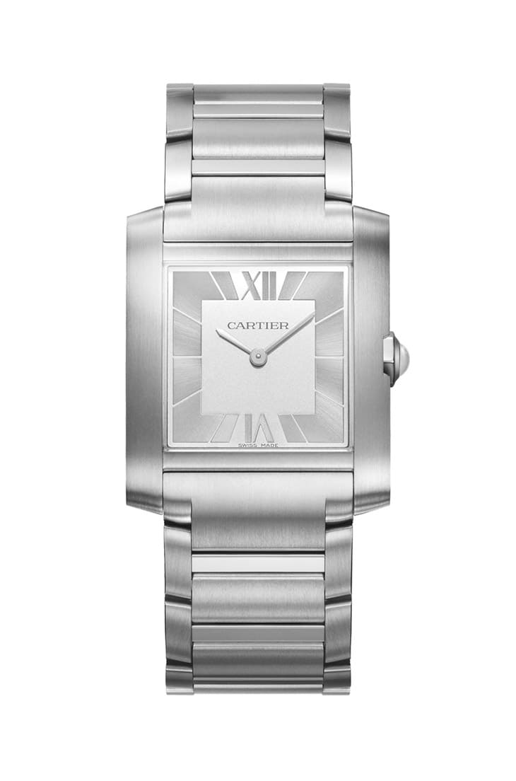 这款就是卡地亚最早发布的日本限定款,手表以2023年改款过的法国坦克为基础,不过手表的银白色面盘与太阳放射纹修饰成新设计,原本清楚分明的罗马数字时标与轨道式刻度,如今只保留12点和6点方向的罗马数字时标,其他时标化为比面盘顏色略深的放射状矩形线条区块,同时品牌捨弃了轨道式刻度,并在表冠镶上凸圆形月光石。由于手表从不锈钢表壳、链带,到面盘、时标与指针等都是相同的银白色系,因此看起来显得特别素雅,风格清新爽朗。