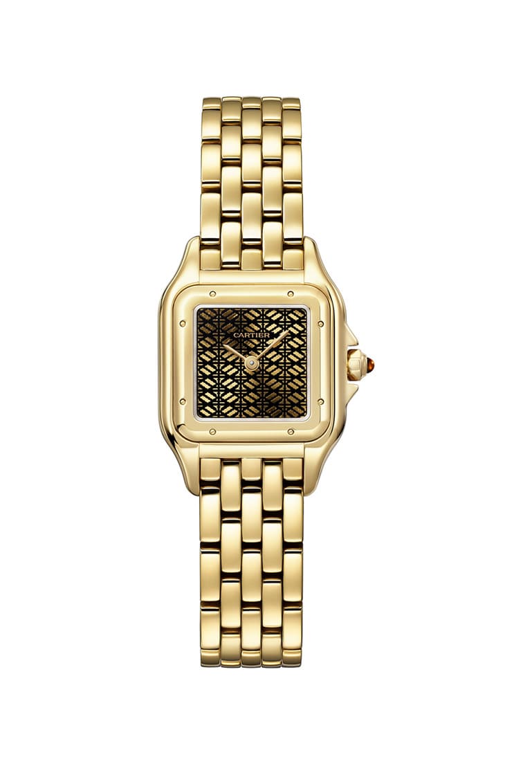 这款有着明显的女表个性,它以黄金制作表壳,尺寸比第一款法国坦克更小,这只虽然也是搭载石英机芯的基本二针款,可是它的面盘呈现出日本限定款独树一帜的亮点。卡地亚在表款面盘加入品牌第三代传人Louis Cartier设计的壁纸图案,黑色线条在金色面盘上交相排列,使得经过太阳放射纹修饰的面盘更富有视觉层次与光影变化效果。此外手表在表冠镶有一颗凸圆面锰铝榴石,在金光闪闪的表壳与链带衬托下格外耀眼。