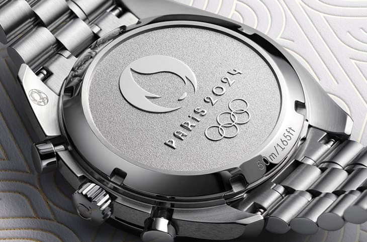 表背底盖镶有一枚18K Moonshine™金徽章,品牌以雷射剥蚀背景再勾勒出拋光2024巴黎奥运代表图案,同时也还包含以不锈钢材质压印的Paris 2024(2024巴黎奥运)字样和代表性的奥运五环,它们在磨砂背景下另以拋光装饰烘托呈现。表款搭载8800大师天文台认证机芯,手表通过瑞士联邦计量科学研究所(METAS)的测试与认证,检测过程需符合比COSC瑞士天文台认证更严格的品质标准才能过关。手表还有个亮点在于表带拥有品牌专利快拆系统,佩戴者可以轻松将链带换成其他替换选项—例如蓝色、白色或红色橡胶表带,或也可以考虑欧米茄为了2024巴黎奥运设计的特别NATO表带。