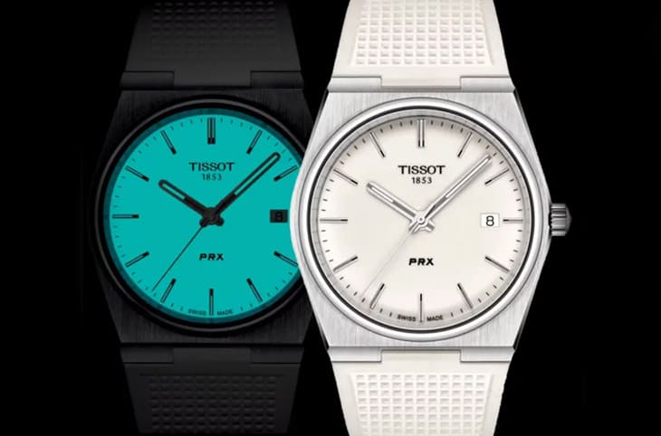 天梭近年颇具声量的PRX系列在2023年增加了这款全夜光面盘版本,它的面盘和其他搭载石英机芯的PRX手表一样没有格纹装饰,但是面盘看起来带点淡淡的乳白色,并且搭配顏色相近的橡胶表带。一旦手表处在暗处,它的面盘就会发出像是绿松石色班的蓝色夜光效果,包含指针和时标也有夜光涂层,不过3点方向的日期显示就没有夜光作用了,在暗处它会变成一块黑色,不过还好一般我们对夜光的需求主要放在时间基本单位就好,看不看得到日期反而是其次。