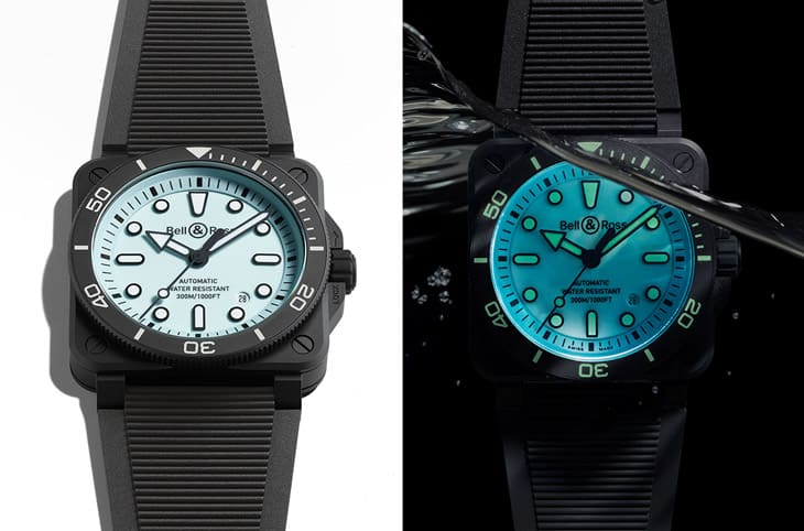 BELL & ROSS的主力系列BR 03最近刚改款旗下潜水表作品,在首波登场的5款作品中,定位最高的要属黑色陶瓷表壳制作的BR 03 Diver Full Lum。品牌这次直接用绿松石色夜光涂层覆盖面盘,在黑色表壳、黑色橡胶表带烘托下,展现这种顏色彷彿为夏天而生的清爽感,另外表圈刻度、时标与指针则是涂上白色Super-LumiNova®夜光涂层(虽然远看会不太明显区隔两种顏色),可是它们在暗处一个是发出蓝色夜光、另一个则是发出绿色夜光,相较前作BR 03-92 Diver Full Lum那种全绿色夜光有了可读性更强的新变化。
