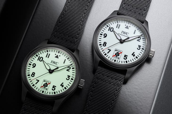 IWC 2024年发表过以Pilot’s Watch Chronograph 41为基础的全夜光陶瓷概念表,手表拥有品牌新研发的崭新Ceralume®技术,使它整只表从表壳、面盘到表带都有夜光效果,但这款还处在概念阶段,因此品牌更早一些创作的飞行员系列Black Aces自动表会是目前实际可以锁定的目标,表款以色陶瓷制成,搭配白色面盘和黑色织物表带的设计和前述泰格豪雅的Aquaracer有点相似,手表融入致敬Black Aces双引擎喷射机的元素,所以面盘6点方向有特殊图腾,IWC用Super-LumiNova®夜光涂料与黏合剂混合而成白色Lumicast面盘,另外它的时、分针也有夜光涂层强化整体效果。