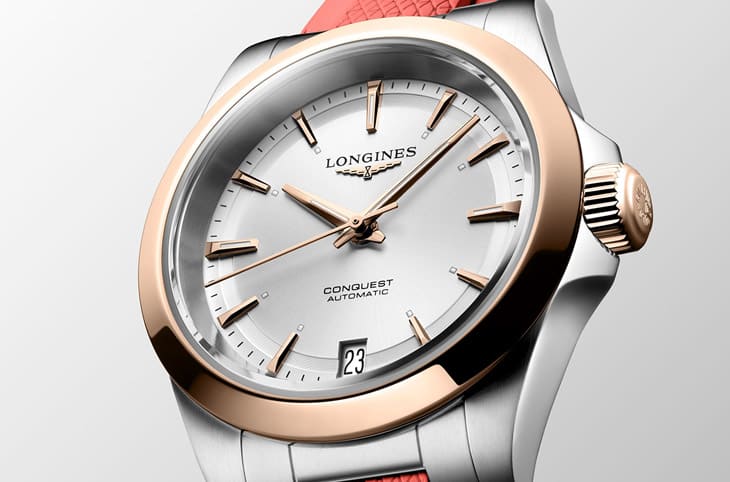 我们注意到全新征服者系列开发出数量颇为丰富的30mm及34mm等女表作品,大致而言它们都具备大三针加日期功能、搭载L592.5(30mm)或L888.5(34mm)自动机芯,除了尺寸差异之外,品牌透过面盘顏色、钻石镶嵌工艺、不同表带类型等细节加以拓展出庞大的产品阵线,甚至34mm款式还出现不锈钢与玫瑰金的双色设计,跳脱系列以不锈钢表壳为主的印象。