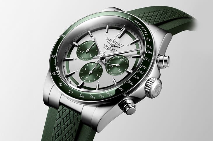 ▲42mm的Conquest 42毫米计时码表加入银面/绿盘新色,同时引进橡胶表带款式。