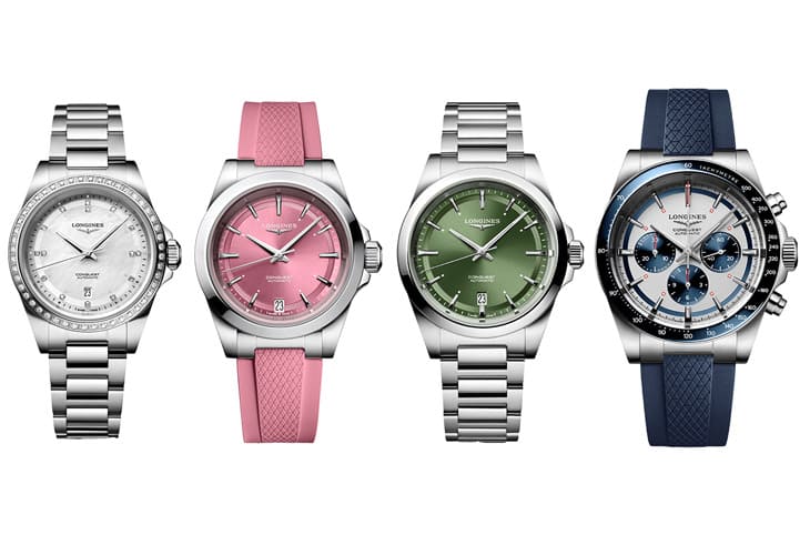 ▲浪琴表以粉嫩色调诠释征服者系列男女皆宜的全方位风格。