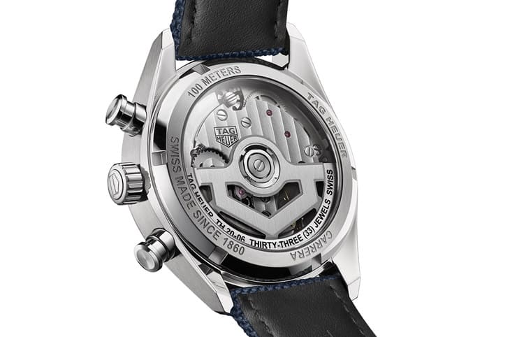 Skipper计时码表当年表背是那时主流的实底盖,到了2023年回归后,泰格豪雅顺应市场喜好变化而改成透明底盖。佩戴者一眼可见手表内部那枚经过改良的TH20-06自动机芯,其双向上链自动盘造型融入代表泰格豪雅的盾形图案,光就外观、便利性等层面,TH20-06自动机芯比起原版Skipper计时码表搭载的Valjoux 7730手上链机芯也都带有与时俱进的进化水准,现代的机芯具备导柱轮搭配垂直离合机制,动力储存达到80小时,规格比起早期的计时机芯更为优异,也让人在重温手表的典雅美型时,内部同时获得更臻优化的精准与长效品质。