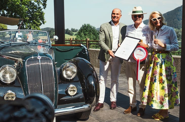 在为期两天的《Concours of Elegance Germany》古董车展中,第一天的颁奖典礼选出全场「Best of Show最佳车款」奖项,此奖由一位Lancia Astura Pinin Farina Cabriolet的车主获得,朗格欧洲区总监Peter Justenhoven代表大会颁发特制的证书给得奖车主——他拿到的证书上富有以手工雕刻的镀金德国银摆轮桥板零件,平常想要拥有这枚零件只有入手朗格手表才有机会,因此能在参加古董车展活动之际,顺便带给珍贵的物件回家,对车手而言不啻是个意外又惊喜的收穫。