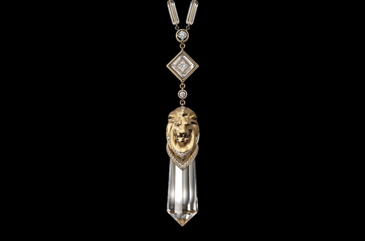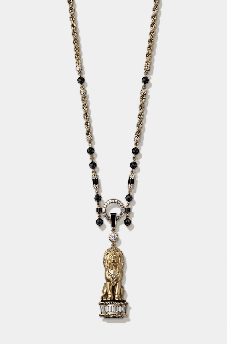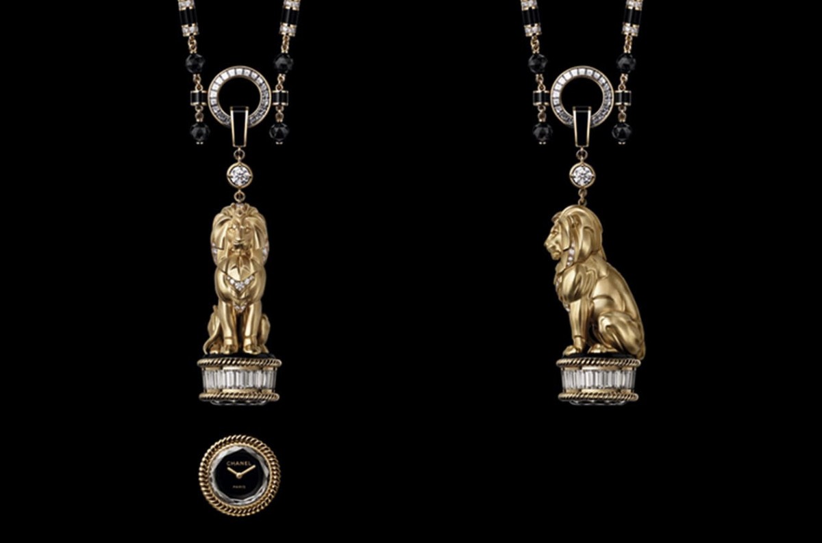 这座细致的狮子雕像造型重现了香奈儿女士1920年代首度前往义大利威尼斯时,对当地所在多见的坐狮雕像留下的强烈记忆,制作过程同样是先制作出较大型的蜡像、微调细节,紧接着才会铸造成金属雕刻并以手工拋磨成型。狮子雕像的底座镶有长阶梯形切割钻石,至于长项链则是以扭索纹链条搭配明亮式切割钻石、刻面縞玛瑙珠串或管珠,交会于镶有钻石的黄金环圈和镶钻主石之上。这样的设计让人想起香奈儿女士当年工作时常会带在身上的狮子造型雕像。