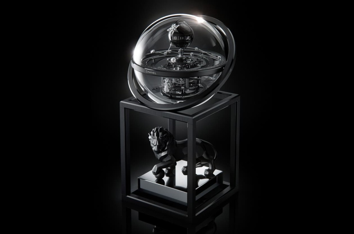 事实上2023年香奈儿与狮子有关的高级制表创作并不侷限在《Mademoiselle Privé狮子钮扣腕表系列》,就连《Interstellar星际》的年度主题中,也有融入狮子形象的作品问世。狮子天文座钟于拋光镂空黑色座钟框架内置一座黑色涂层的黄铜雕刻立体狮像,框架上方固定有内部为机械组件的玻璃球体,球体搭配黑色固定框架彷似行星。座钟内部的机械组件包括白金彗星时针指示小时、由9颗钻石象徵星星组成的狮子座形体分针指示分钟,另有水滴形水晶代表秒数持续推进,将单纯的时间显示与星座、宇宙概念结合,呈现出跨越时空、既神秘也浪漫的显时效果。
