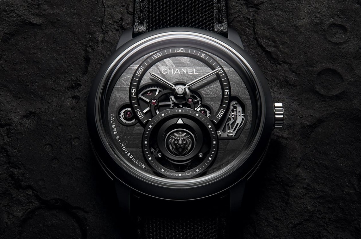同样归属于《Interstellar星际》主题中的尚有Monsieur陀飞轮陨石腕表,这款作品也和狮子符码有关,香奈儿奠基于旗下第五枚自制机芯Caliber 5,将之首度导入Monsieur de Chanel系列,从而昇华成视觉造型气势非凡的Caliber 5.1。从Caliber 5进化至Caliber 5.1,品牌针对机芯结构进行了不少调整,包括替陀飞轮加入小秒显示、发条盒由一枚提升至两枚、动力储存因而增加至72小时;此外,Caliber 5.1更将陀飞轮框架原本的钻石轴心改成以钛合金雷射雕刻成的立体狮首图腾,这使得腕表设计更有专属香奈儿的特色。而以天然陨石制作的面盘,完整了这只腕表具体呼应星际的年度主题。