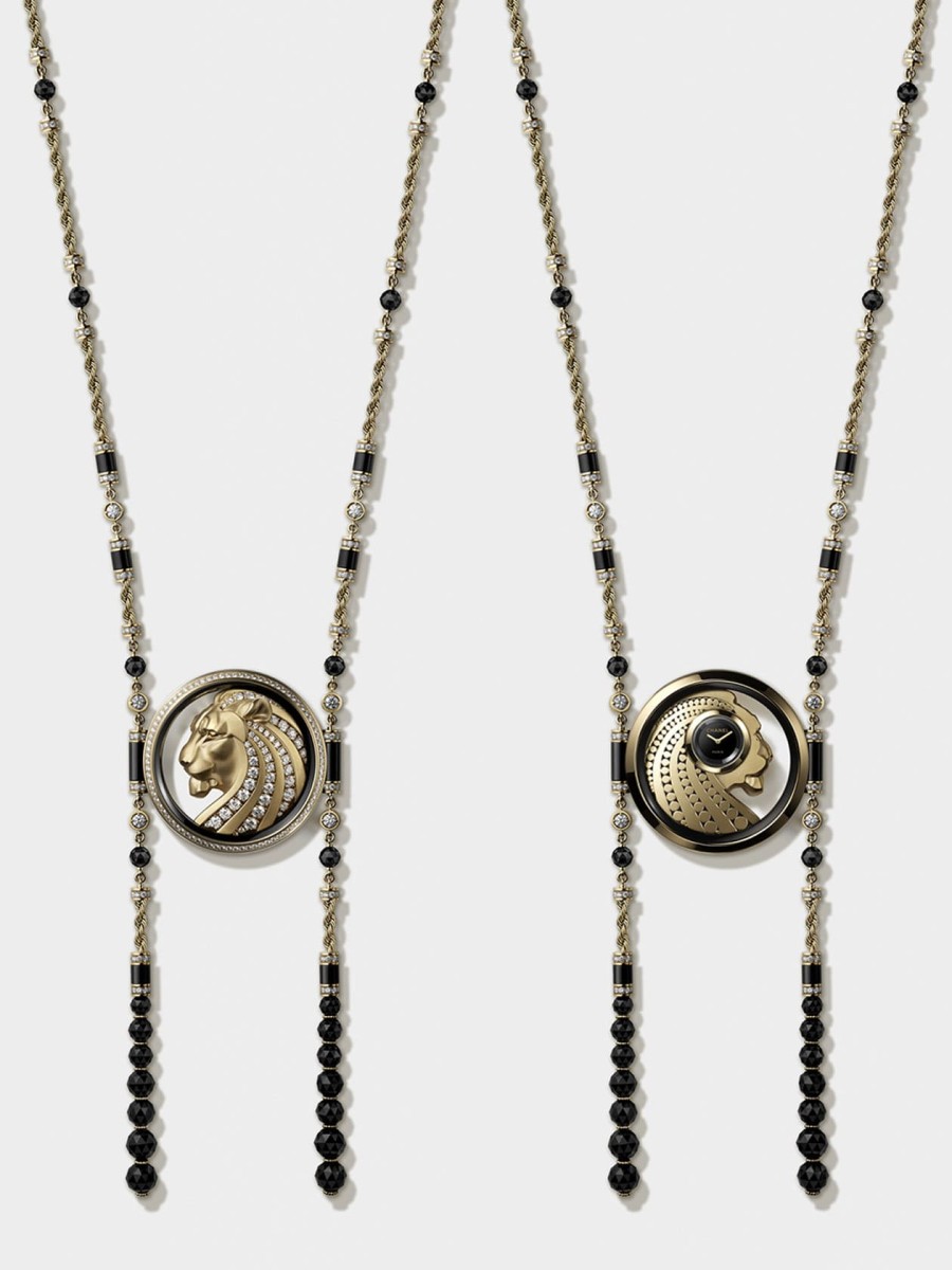 Crystal Lion长项链表的链条由黄金包边的明亮式切割钻石及水晶管珠组成,光是手工将这些宝石穿链就需花上300个工时,最终交匯于一颗约重0.7克拉的钻石。至于显时的功能,腕表创意工作室设计将一颗1克拉公主型切割钻石装饰在正面,背面以白金制成的面盘与黄金指针搭配显示时间,调校时间可透过前述的公主型切割钻石操作,按动一下快调时针、连续按动则是调整分针。显时面盘专属于配戴者的设计,完美将时计功能隐藏于长项链的外观之中。