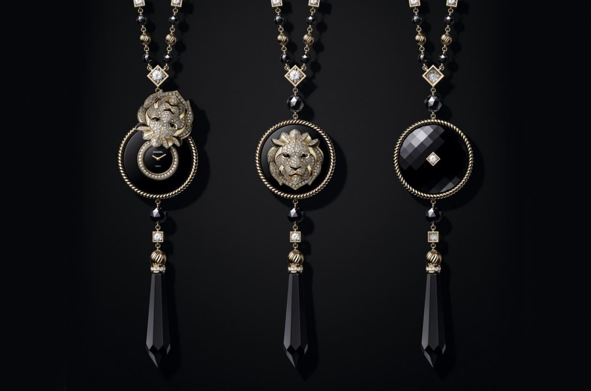 Médaillon Lion长项链表以黄金、縞玛瑙与钻石组成黑金闪耀的视觉。在主要的雕刻狮像部分,品牌费时三个月先制作出狮子雕塑——由工艺师制作出放大两倍的蜡像,接着以手工微调狮子的轮廓、表情等细节,完成后交由巴黎工坊铸造,继而由工匠进行手工拋光或雾面修饰,香奈儿在雕塑狮像时有先预留轨道供后续镶嵌钻石之用,使得狮子图腾能够被钻石完美点缀。Médaillon Lion长项链表的吊坠类似徽章概念,其内、外壳都饰有縞玛瑙,并且固定在链条中的縞玛瑙管珠上,从中看不到任何额外的固定零件,设计精巧令人惊艳。表款的扭索纹链条交错镶嵌明亮式切割钻石以及刻面縞玛瑙珠串,是从20世纪初期盛行的装饰艺术风格获得启发,搭配雕刻狮像徽章,乍看犹如一款单纯奢华的长项链。
