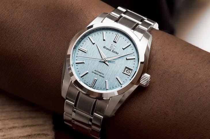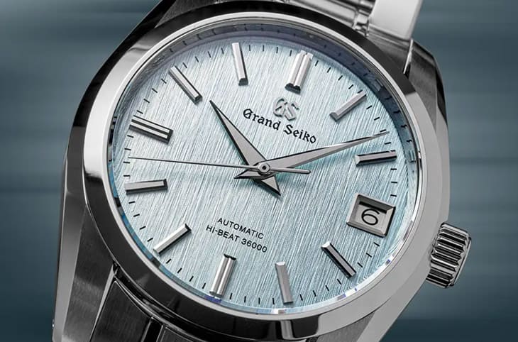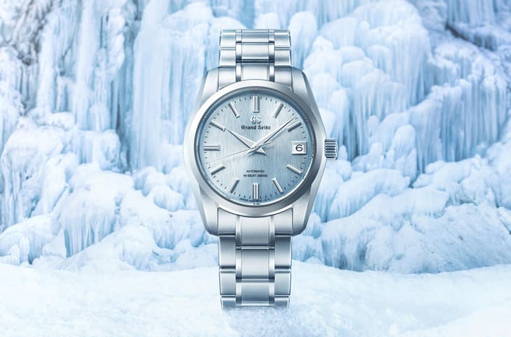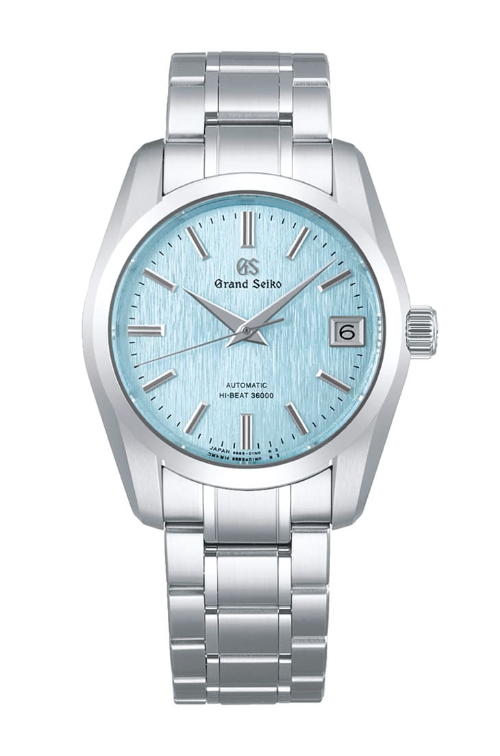 表款的冰蓝色面盘设计灵感来自从GS雫石工坊眺望远方可见的岩手山,具体而言品牌是想要呈现岩手山冬季的冰瀑景象,在严寒时节岩手山的瀑布因为当地温度往往在摄氏零度以下,因此水流会慢慢结冰,最终形成坚挺的冰瀑,品牌为了揣摩冰瀑的意境,因此将冰蓝色与垂直拉丝纹理结合,让人彷彿看到了水流冻结的过程,在手表面盘上形成冰冷又坚固的固态冰形状。面盘配有带有立体切面的时标、太妃式指针,3点方向的日期视窗也精心设有边框,裡面的日期转盘为银底黑字,和指针与时标,乃至整个冰蓝面的风格相得益彰。