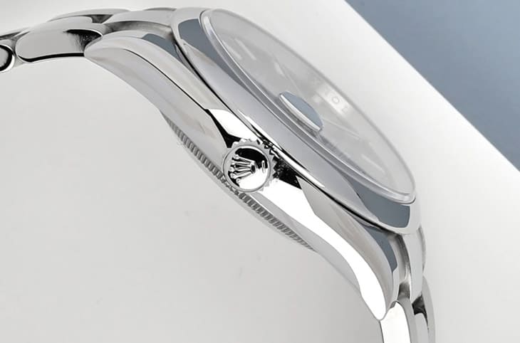 表径36mm的126200表壳厚度为11.7mm左右,这有助于让手表完美贴合在手腕上,拋光表圈由于少了起伏线条,因此就视觉上手表也是贴近于手腕的,这点必需佩服品牌设计时的深思熟虑。而就算尺寸为小一点的36mm,126200镜面3点方向还是设有Cyclops小窗凸透镜以放大日期显示的视读效果,对于消费者而言这是一个两极化的设计,不爱的人会觉得装凸透镜会让手表显得较为老气,但也有更多的人认为这就是劳力士的招牌特徵,尤其每个人都会年纪渐长,在视力逐渐退化之际,会发现小窗凸透镜绝对不是设来好看的,有它辅助辨时的作用在。