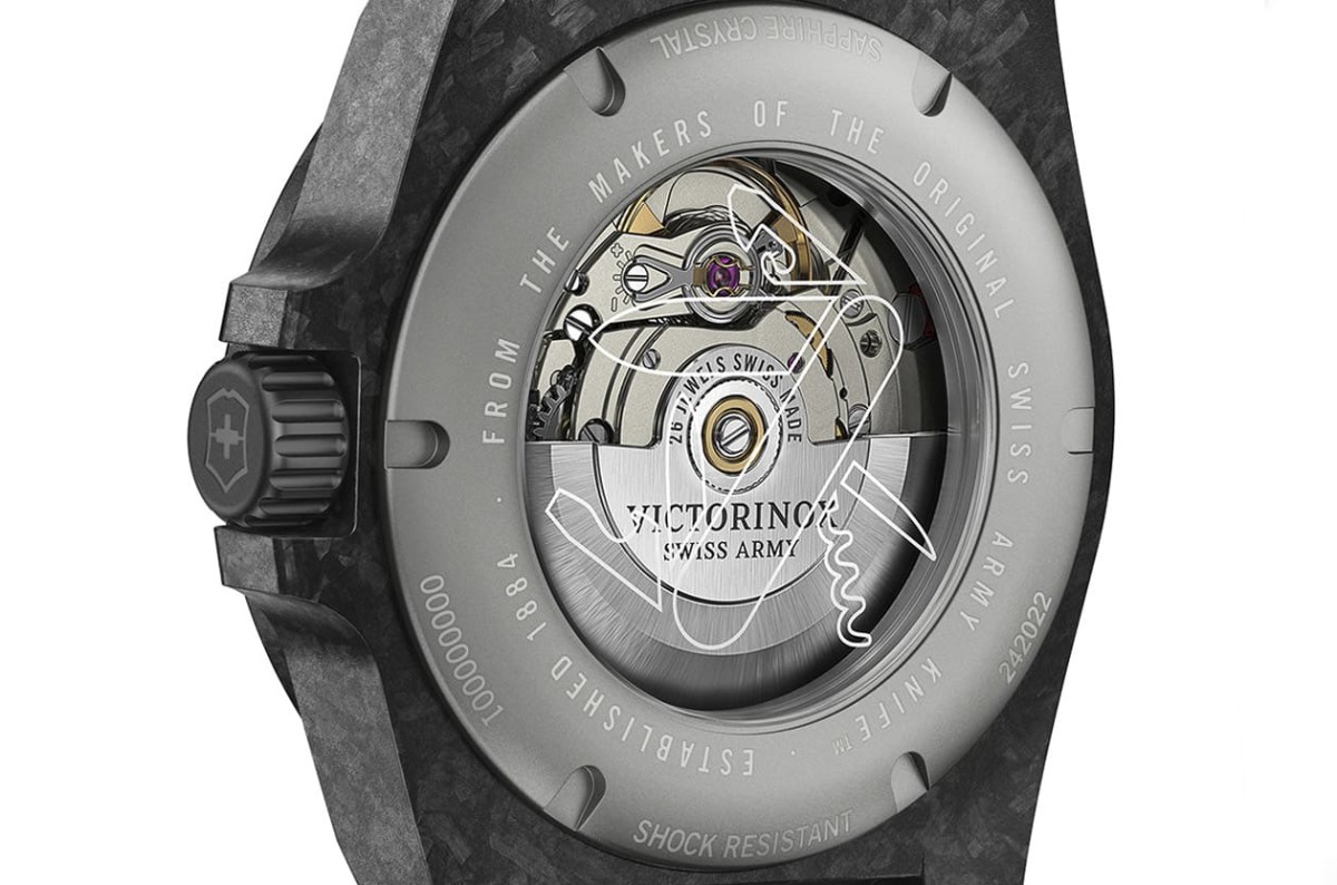 ▲表背透明底盖印有瑞士军刀图案,一展品牌自豪的工艺基因,腕表内部搭载的Sellita机芯品质久经市场洗礼,品质可靠。