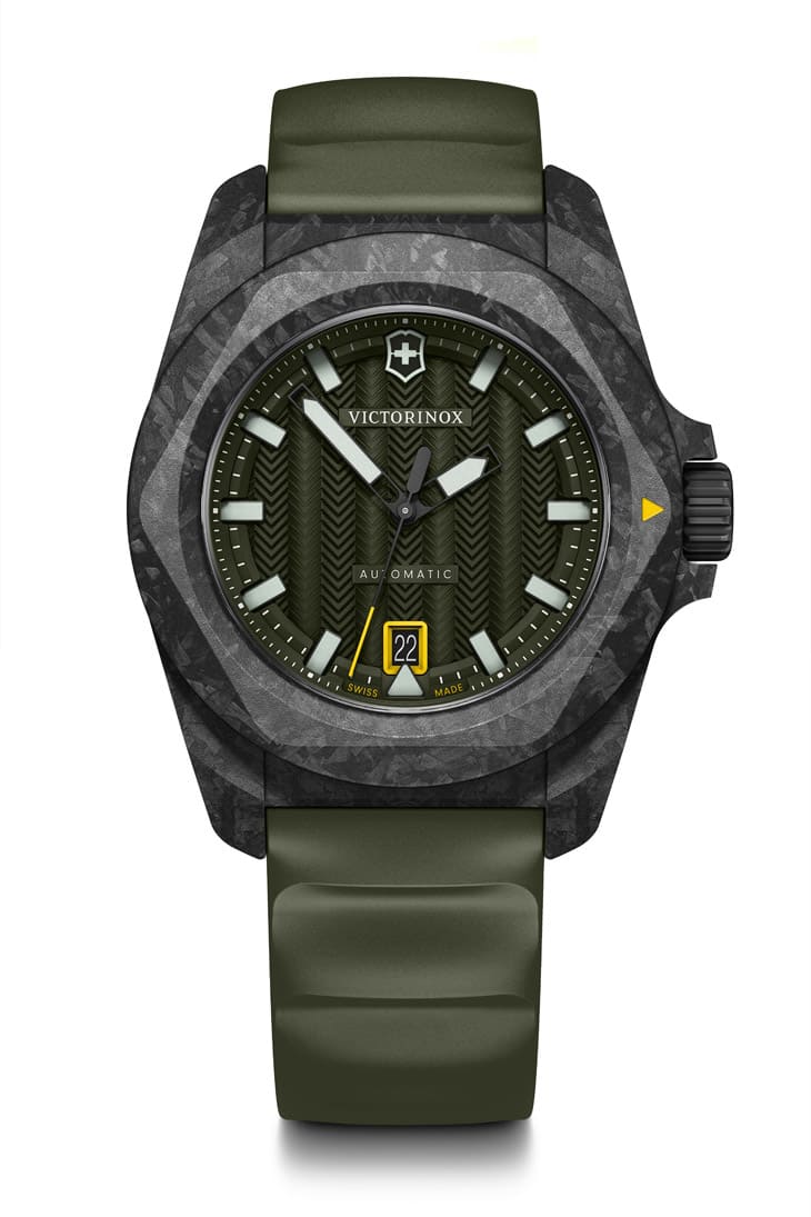 不锈钢款或碳纤维款I.N.O.X. Automatic腕表的面盘格局大致相同,包括指针、时标造型、设置在6点方向的日期窗都一致,例如秒针末端配重採用的瑞士军刀造型便十分易认,不过瑞士维氏为了进一步区隔两种款式的个性,分别替不锈钢款配置品牌经典Alox钢纹图案、碳纤维款则是採用人字纹致敬瑞士雄伟的山脉等壮阔自然景致。