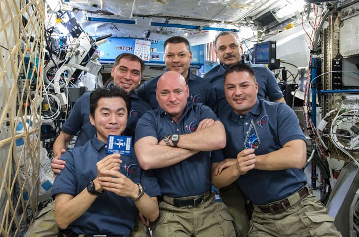 ▲美国太空人Scott Kelly(前中)曾在2015年于国际太空站力助俄国太空人Sergey Volkov(后左)修好他的百年灵Chronomat链带。Source:Oracle Time