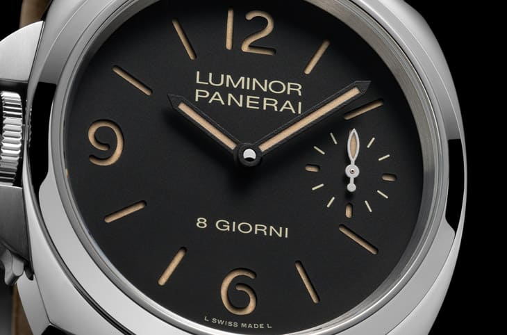 手表面盘为三明治结构,中间的Super-LumiNova®夜光涂层为米色,包括镀成黑色的指针其夜光涂层也是相同顏色,在黑色面盘衬托下,会让手表呈现出前述的怀旧感。而受到机芯转了180度的关系,因此这款表的小秒显示也就从9点方向转移到3点方向,另外面盘6点方向印上的"8 GIORNI"字样就算看不懂后面的义大利文,从数字方面也不难推测此处写的是指手表的动力储存空间。