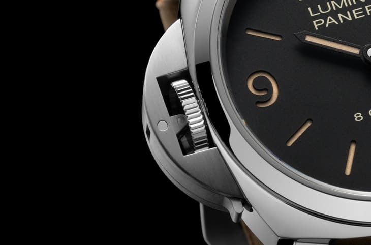 随着表冠一起往左挪移到左边的自然就是Luminor不动特徵的表冠护桥,有别于先前Luminor左冠表护桥上的锁桿和右冠表同样都是由上往下扳开,这次PAM01655刻意将护桥的锁桿倒过来,变成要由下往上扳,而且沛纳海设计左冠表时,护桥上原本刻的字样如"REG"和"T.M."等也都被捨弃,纯以雾面修饰点缀,这点PAM01655则与先前的作品保持一致。