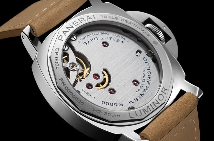 ▲PAM01655搭载的P.5000机芯为简约小三针功能,其以两枚发条盒输出8日动能,大幅提升手表佩戴实用性。