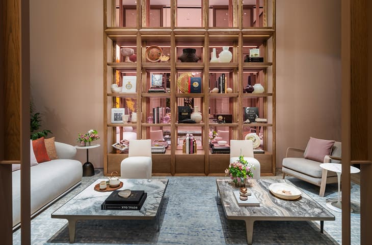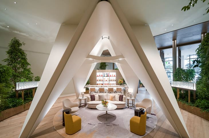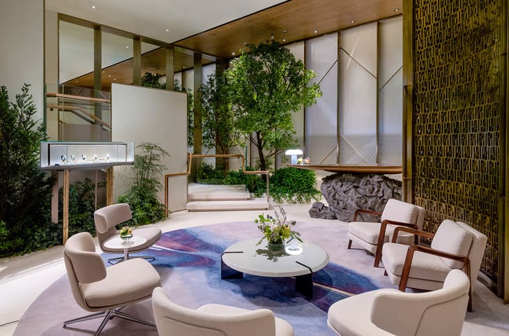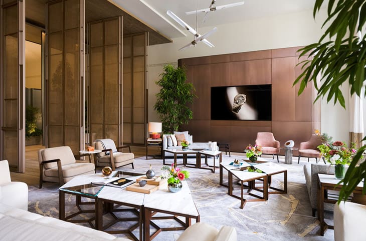 走进店内,设计师以亚洲花园为灵感的想法不言而喻,空间中蕴含木材、石材以及各种植物,加上挑高格局以及大片落地窗带来的自然採光,绿意盎然的市内空间瞬间让人有一种置身在瑞士山谷的临场感,这也是AP House为什麼如此独特的原因之一,在传统表店中几乎不可能找到相似的场景,于此能倍感放松和舒适。店内以阶梯、拱门和大型滑动墙作为联系以及切换用餐和休息区的枢纽,空间既能相连,也可以独立运作,爱彼策划各种活动时也更能因「事」制宜地保持弹性。