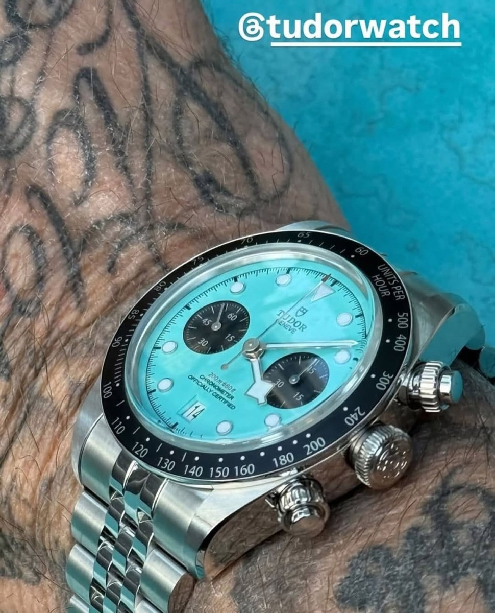不只如此,贝克汉还加码在限时动态秀出手表的特写照,这下再没有疑问了,几乎篤定帝舵打造出一款绿松石色面盘的Black Bay Chrono,而且既然周董和贝克汉都有,那表示手表应该不是特别为了他们其中一人客制的专属收藏品,这样一来最近这些提前曝光神祕表的举动,愈来愈有在预告2025年新品的意味,不过在TUDOR没有正式发表之前,一切都只是属于臆测,而且现在离4月的日内瓦钟表与奇迹表展还有一段时间,就算这款表之后会市售,那麼发布的时间会在表展之前还是表展举行后?就让我们继续看下去吧。