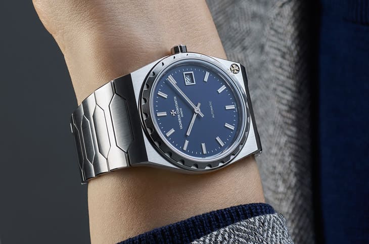 不锈钢Historiques 222的整体外观彷彿一只保存完好的古董表,它的面盘似乎呈现出些许褪色感、夜光涂层也带点微微泛黄,甚至表壳表面也带有一些岁月痕跡的味道,它既如同一枚被放在时间胶囊裡的手表,但同时具备了现代制表的多重优点,是一款名副其实的现代新译作品。不锈钢Historiques 222在尺寸上与原版222运动表几乎一致,例如表壳直径皆为37mm,倒是表壳厚度7.95mm比原版的7.2mm稍微多一些,此外表壳和链带均採用拉丝处理,并在边缘处进行了倒角拋光。不锈钢Historiques 222的佩戴感受舒适度让人惊艳,在视觉上其大小与蓝面36mm的劳力士Oyster Perpetual相似,若与其他尺寸接近的一体式运动腕相比,不锈钢Historiques 222的佩戴感更像是佩戴一个能在袖口来去自如的中性尺寸手表。