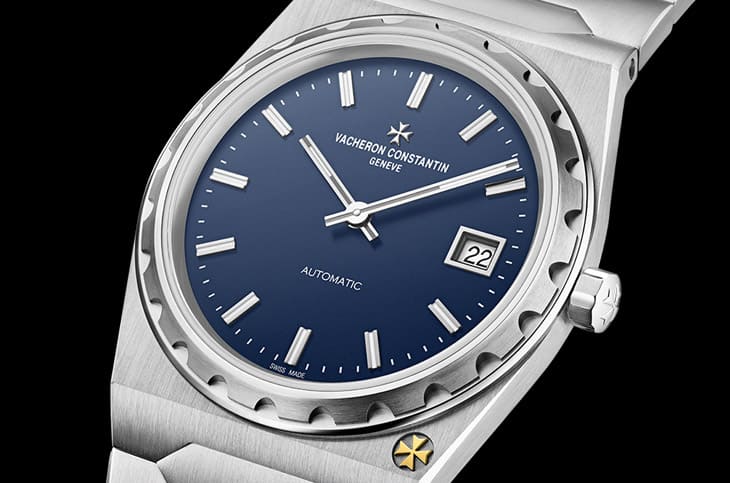 表款面盘为雾面蓝色,时针、分针和时标採用略带米色的夜光涂层,让人联想到过往的氚气夜光面盘。最初看到222搭配蓝色面盘时,或许会感到有些意外,因为黄金款Historiques 222配的是金色面盘,而且原版222运动表也出过多种不同顏色的面盘,因此为什麼江诗丹顿会特别选择蓝色面盘令人好奇,或许这样可以强化与Overseas系列的连结也说不定。我们甚至还能预期,一旦这款表的热度日后逐渐消退,江诗丹顿还会推出更多不同面盘配色的后继版本延续手表的话题热度。包括时针、分针、时标以及面盘上的马尔他十字标志均採用白金材质制作,值得一提的是,指针的SuperLuminova夜光涂层并非覆盖整枚指针,而是仅覆盖指针前端约三分之一的区域,所谓的「用得多不如用得巧」大概就是指这种状况,只要达到协助辨时的目的,夜光涂层的确不一定要涂满才有效。此外还可以注意到面盘6点方向上的"AUTOMATIC"字样,其字体也採用了复古风格,呼应手表整体的复古调性。
