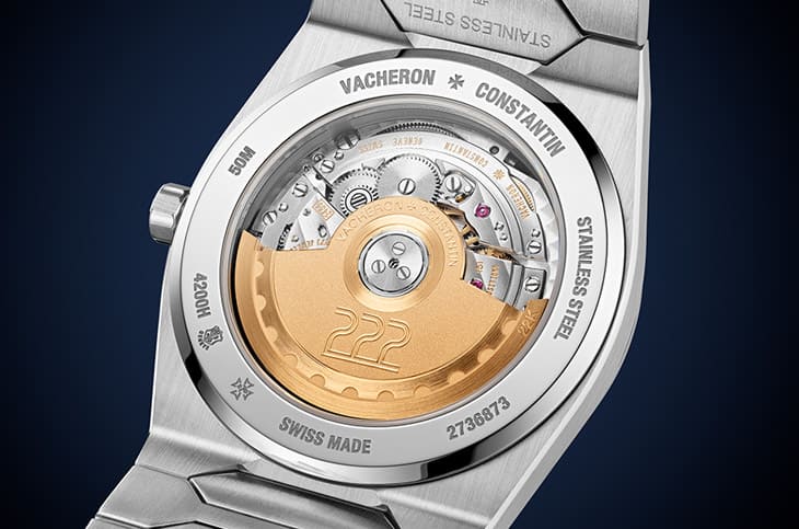 Historiques 222无论不锈钢或黄金款式皆搭载2455/2自动机芯。儘管这枚机芯并非前几年随着黄金Historiques 222而全新研发的作品,事实上它在那之前便已经推出多年了,但在可靠性和精准度方面依旧表现出色。当然对于热衷于技术创新的表迷来说,这或许会是这款作品美中不足的地方,毕竟江诗丹顿拥有表坛巨头等级的制表工艺,他们完全可以在基础机芯上投入更多心力,不一定只有在创作阁楼工匠系列时才大展大师级身手,但事实与期待之间总不一定能对接。在2455/2自动机芯并没有什麼特殊缺陷、又是一枚日内瓦印记水准的前提下,不锈钢Historiques 222拥有它作为核心基础还是有令人满意的钱。这枚机芯的尺寸为26.2x3.6mm,比起爱彼RO 16202ST搭载的7121机芯小一点也厚一点,不过整体来说还算是纤薄机芯等级。在透明底盖下会很快注意到它的K金自动盘,上头刻有222的标志——这是从原版222运动表实底盖图案沿用而来的巧思,既然现代新译版改成了透背,至少可以用相同的222标志让人回忆起过往作品的风采。除了2455/2自动机芯并非江诗丹顿为了Historiques 222崭新研发的作品之外,它的动力储存40小时也是会令人比较有意见的地方,表主只能尽量每天戴这款表出门,让手表不断获得新动能,自然也就不用担心动力用完的情况。