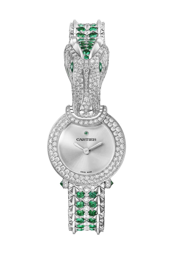 同系列另一款Crocodile珠宝腕表以白金材质制作,鱷鱼头部造型以及代表身体、尾巴部位的链带亦镶满钻石,尽显奢华气息,加上链带精心刻划出工整而立体的鳞片状,详实捕捉立体的鱷鱼形象。CARTIER于鱷鱼眼睛以及身体等处额外镶嵌祖母绿宝石,腕表以钻石的洁白光芒与白金表壳完美交融,而祖母绿的绿色调则是完整了鱷鱼的经典形象。一如Tiger珠宝腕表,鱷鱼款式呼应表壳材质採用银色太阳放射纹面盘,搭配银色的时、分指针,12点方向特地镶上用以提示方位,并有时标用意的圆形明亮式切割祖母绿1颗,收到画龙点睛的装饰功效。
