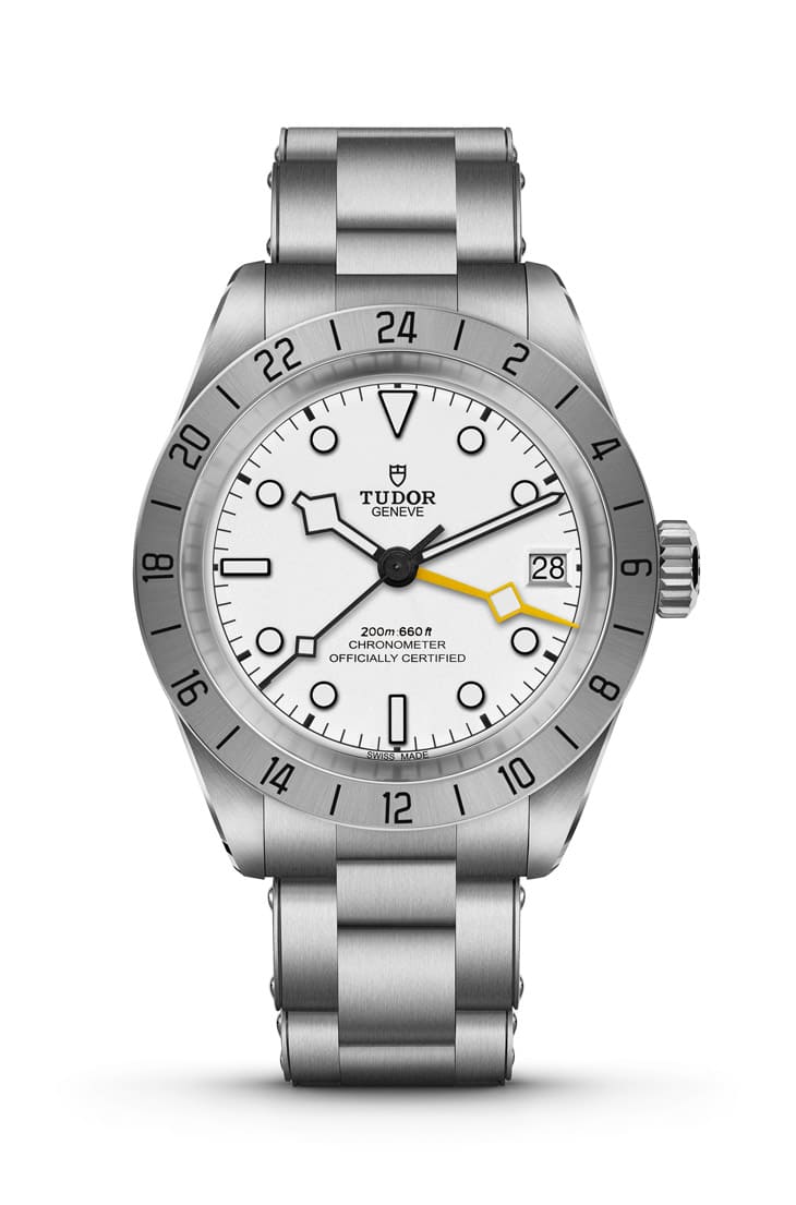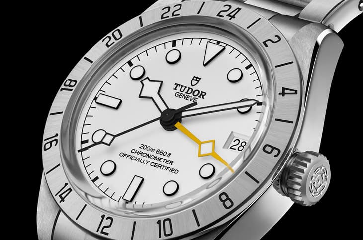2025年Black Bay Pro的蛋白色面盘是这款作品最明显的变化之处。相比前作的黑色面盘,蛋白色面盘更为清新明亮,并在不同光线条件下展现出色易读性。蓝宝石水晶镜面的圆拱形设计,可以让视觉效果更加柔和而且耐看,而立体的陶瓷时标于黑色边框强化存在感之餘,还覆上满满的Super-LumiNova®夜光涂层,确保时间显示不受环境明暗影响。这样的设计不仅提升手表的美感,也同时保证其专业工具表的定位,让人一眼就能感受到其专注于机能性的创作本质。面盘除了有Black Bay系列着名的「雪花」指针,还多了一枚黄色菱形指针用以指示第二地时区时间,其与黑面的前作顏色一致,它每24小时会绕行面盘一周,非常适合经常出差或旅行的佩戴者。附带一提,所在地时间的雪花指针较短,但可以独立调整,方便使用者根据不同需求进行重新设置。