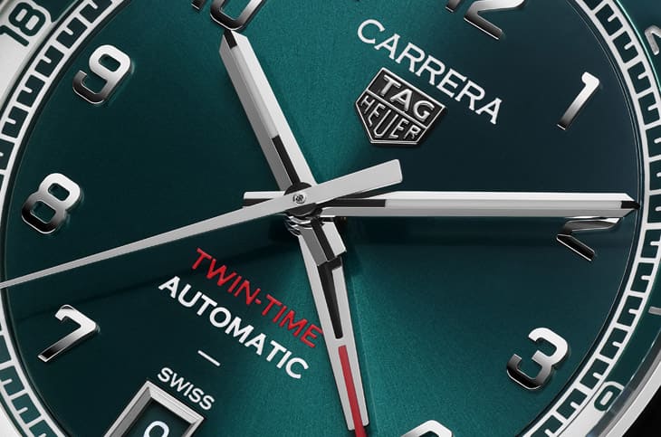 TAG HEUER替手表选用湖水绿色太阳放射纹面盘,在光线下会呈现出变化丰富的光影层次,有点像是汽油绿混合英国赛车绿,视觉感受颇为吸睛。面盘周围的24小时凸缘则採用银色与湖水绿双色设计,色彩自然过渡,不但提升辨识性,也让整个面盘更有层次感。镀銠立体阿拉伯数字时标的字型灵感来自时速计,看起来运动感十足。儘管时标本身没有夜光效果,但分钟刻度有覆盖Super-LumiNova夜光涂层,在夜晚依然清晰可读。泰格豪雅重新设计了红色尖端细长指针,灵感来自早期两地时间手表和制表师常用的镊子工具,既有致敬的用意,也是一种提升视读性的方式。此外,"Twin-Time"字样也以醒目的红色标示,与GMT指针形成有趣的呼应。手表的日期窗设置在6点方向,採用与面盘一致的色调设计,整体看起来更加融洽而不突兀。时、分针皆为镀銠拋光并填充夜光涂料,夜晚判读同样不成问题。