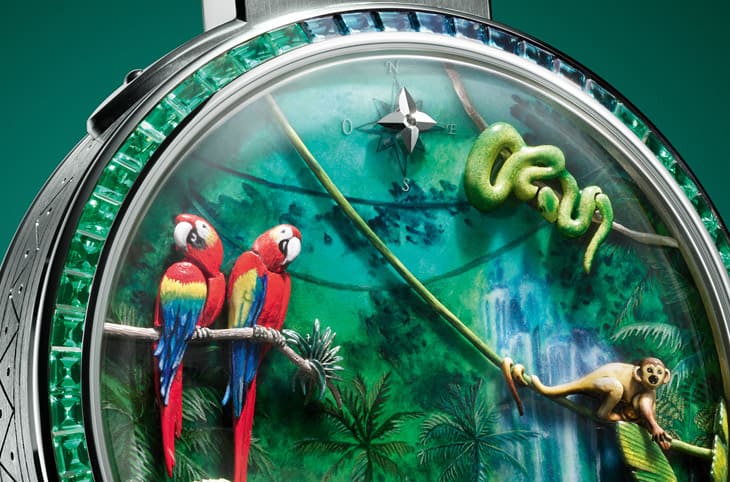 总计整个面盘包含七段动画,动员十五枚独立机械零件,全部都能活动,全部都各自有节奏。这种精密程度已经不只是钟表而已,更像是艺术、雕刻和工程的集合。面盘的每个元素,不是用印刷或贴片,而是手工雕刻加上珐琅上色,例如画面右上方那条小小的蛇,全长不到一公分,却要能刻出数百片鳞片。其他像是鸚鵡羽毛、独木舟上的木纹,都是在薄薄的黄金上手工雕出来,再一层层上色烧制完成,制作难度多高、要花超多时间制作可想而知。