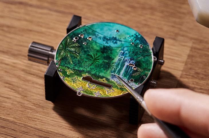 ▲运用微绘与嵌饰珐琅双技法,结合31种色彩,历经30次烧制打造光影层次,甚至首次于镜面呈现立体珐琅效果。