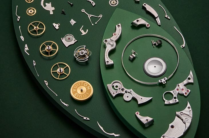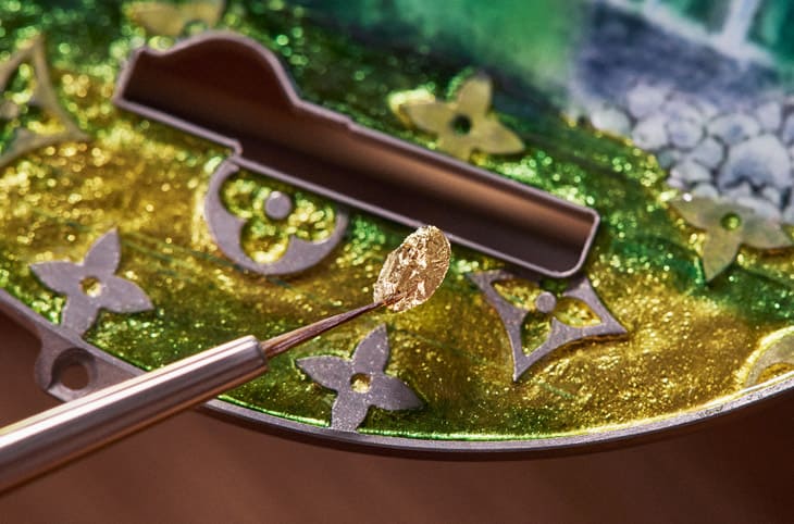 为了把亚马逊雨林的色彩还原到极致,怀表面盘用了多达31种顏色的珐琅,从深绿到翡翠绿、从宝蓝到天蓝,再加上白色和土棕。这些色彩不只单纯是填上去,而是用透明、不透明与乳白三种不同性质的珐琅交织出层次和立体感,然而这可不是画画还有机会用顏色覆盖、修改,在烧制过程中如果有任何拆错就会全毁。值得一提的是,路易威登为了让河流呈现金色波光效果,还特别用上了金属薄片嵌饰珐琅这种相当罕见、难度爆表的工艺。