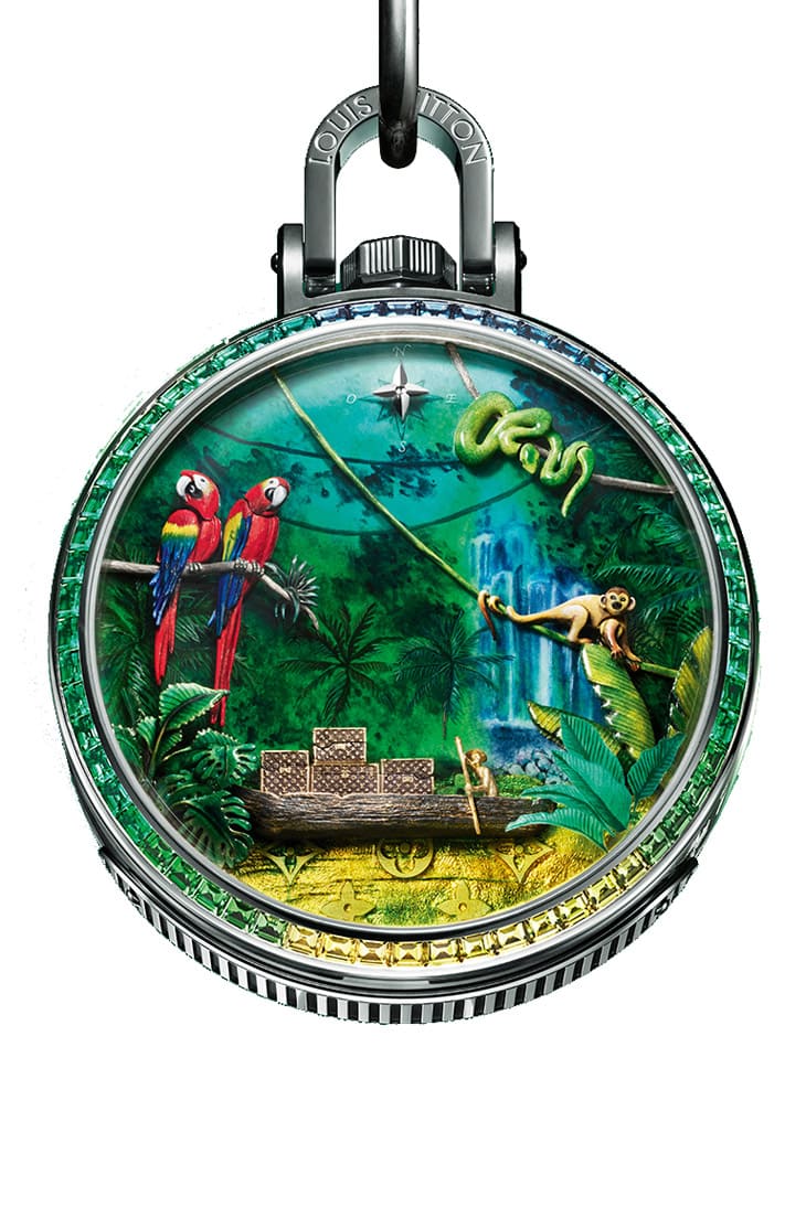 这款直径50mm的怀表,外壳犹如一场精湛的工艺成果展,其以18K白金制成,表圈镶满渐层色宝石,包括祖母绿、沙弗莱石、碧璽、黄色蓝宝石等总共60颗,像是一道彩虹环绕在亚马逊雨林外围,而这个白金表壳,灵感又是来自LV经典行李箱,甚至连侧边雕刻都呼应他们深植人心的旅行主题。