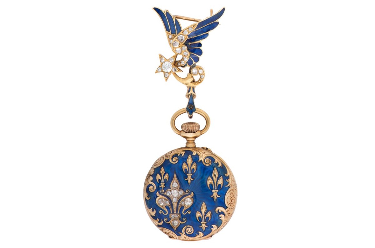 ▲1899年制怀表,18K黄金材质,金雕、机刻与蓝色珐琅装饰,另含百合花钻石镶嵌。