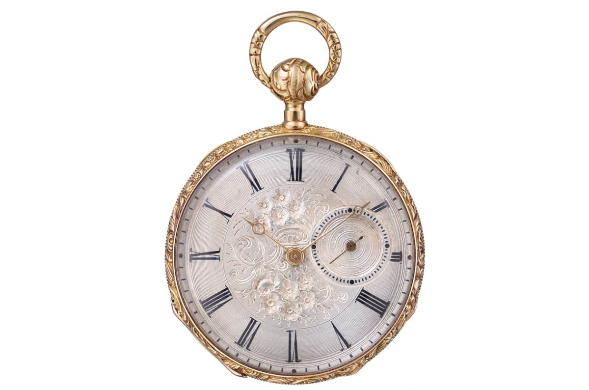 ▲1938年制怀表,18K黄金材质,金雕与凿雕面盘。