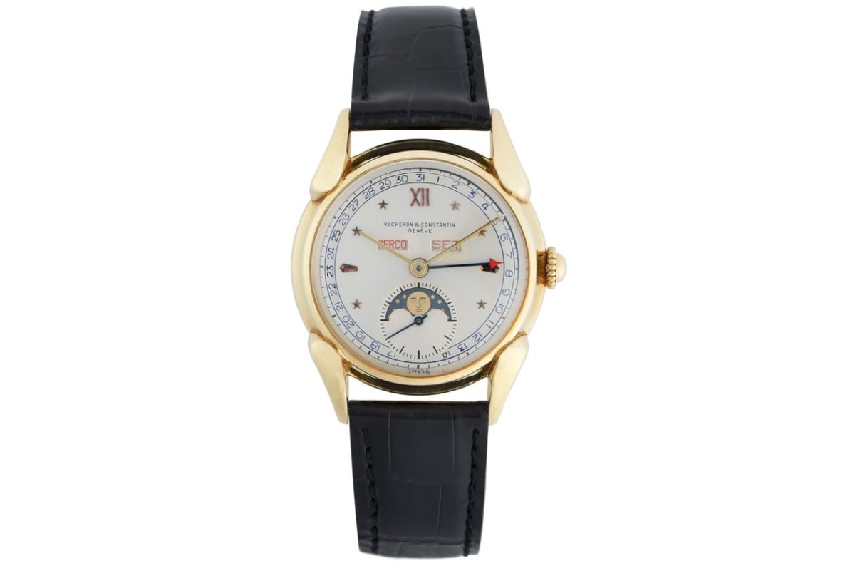 ▲1950年制腕表,18K黄金材质,面盘呈现日、星、月份三重历象以及月相显示。