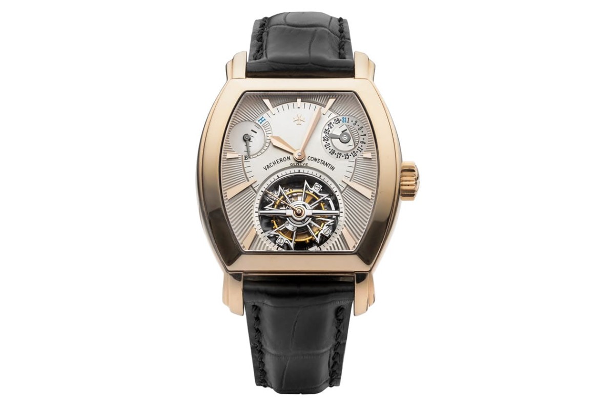 ▲2003年制腕表,18K玫瑰金材质,6点方向设有陀飞轮,面盘另有日期语动力储存显示。
