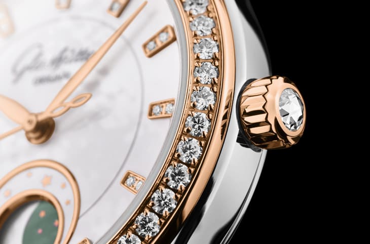 说到这系列的月相设计,也是不得不提的亮点,格拉苏蒂原创并没有用传统那种对称月亮图案,而是设计成四个圆形图案的排列,像是在手腕上看一场迷你星空秀,月相盘还用了珍珠母贝与大溪地贝壳组合,让视觉层次更丰富,加上机芯精准度够高,理论上122年才会出现一天的误差,日常使用基本可以忘记它还有月相误差这回事。