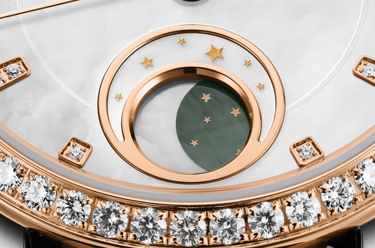 18K玫瑰金材质/Calibre 35-14自动上链机芯/时、分、秒显示/月相显示/珍珠母贝面盘/表圈镶钻48颗、面盘镶钻20颗/蓝宝石水晶镜面、透明底盖/防水30米/表径32.5mm/参考价:NT$ 748,000