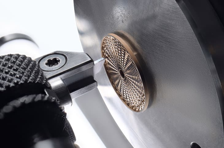 ▲新月形950铂金自动盘以垂直拉丝装饰,高密度提升上链效率,也向宝璣悠久的历史荣光致意。